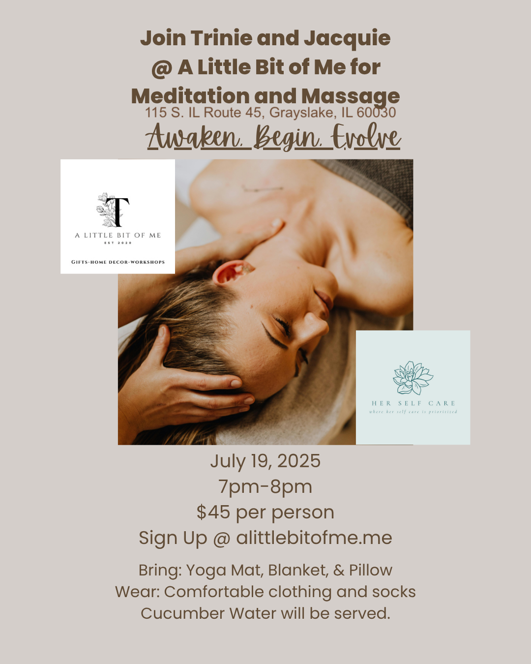 Join me and Trinie, Owner of “A little bit of me”, for an hour-long, women’s only, group guided imagery meditation and scalp & shoulder massage. Ensure you’re ready for great things in the new year!